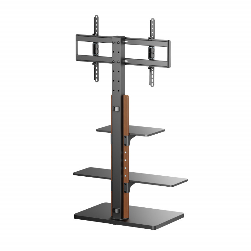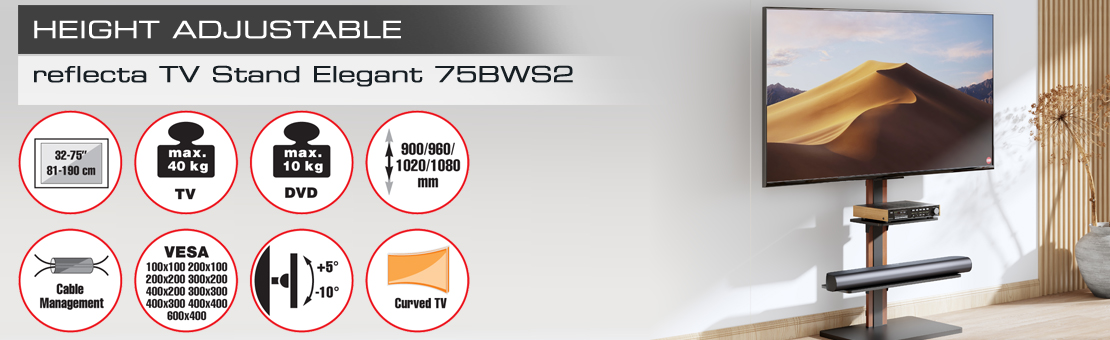 The TV Stand Elegant 75BWS2 allows for 4-level height adjustments of the screen, and it also enables tilting the screen up or down to achieve the perfect viewing angle. 2 shelves offer ample storage space for AV devices, remote controls, soundbars, and other items. The cable management system at the back of the stand helps organize messy wires, ensuring a clean and tidy setup.